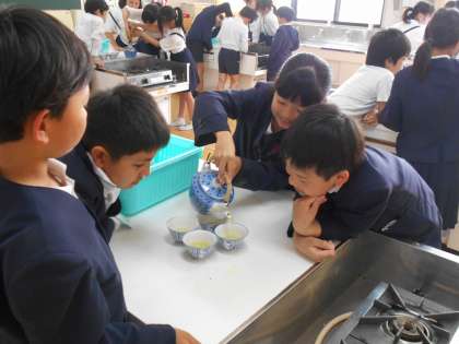 調理実習では、きゅうすでお茶を入れる活動に取り組みました。その後は、みんなでおいしくいただきました。