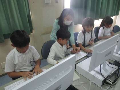 先週始まったパソコンクラブでは、みんなで話し合ってパソコンを使う基本的な操作の練習に取り組んでいます。先週は「マウス」を使う練習でした。今週は「文字を入力する」練習です。パソコン教室に置いてある「ポケモンチャレンジ」というソフトを使って、ゲームをクリアしていきながら、キーボードを打つ練習をしました。クリアする度に、喜びの声やガッツポーズがみられました。
