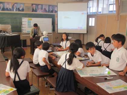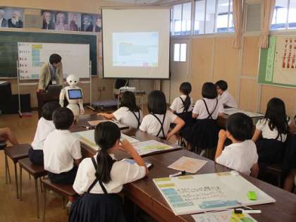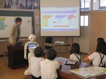 今週からプログラミング学習が始まりました。どこかで見たことあるペッパー君が教室の中にいて、興味津々でした。「プログラミングとは」から教えてもらい、みんなでペッパー君に自己紹介させるプログラミングを班で考えました。