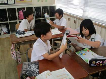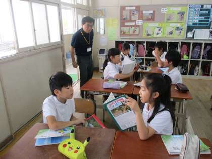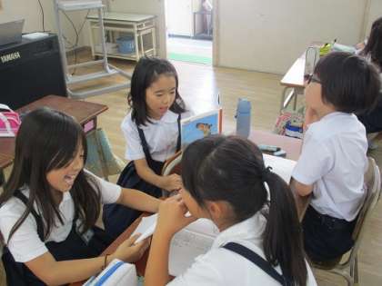 一人ひとりが考えたことを隣の人と、「お客さん役」「案内係役」に分かれて実際に会話をしてみました。同じ問い合わせのはずですが、答え方がいろいろあって、友だちの考えを聞くだけで、自分の考えもますます深まりました。