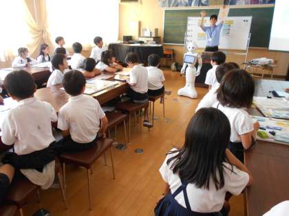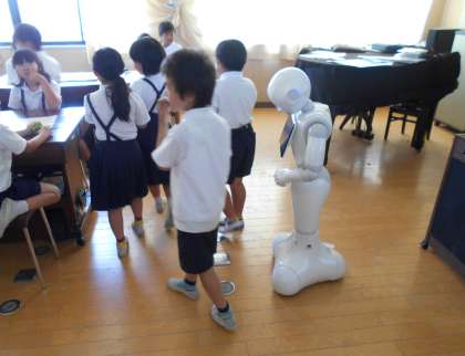 今日の4・5時間目にプログラミングの学習をしました。タブレットを使って入力すると、前のペッパーくんが動いたり、しゃべったりしました。グループで相談して入力すると、そのように動くので子ども達も楽しみながら、学習しました