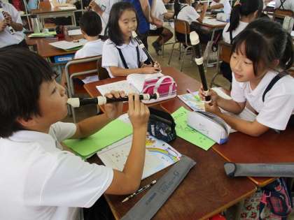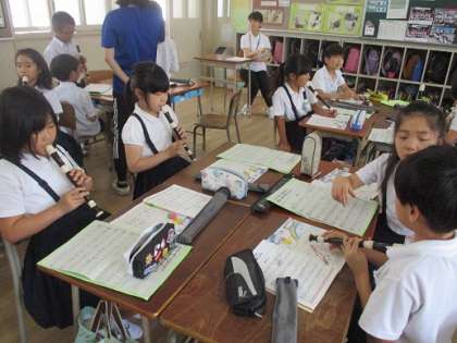 先日「歌のにじ」という曲でリコーダーのテストをしました。今日は同じ曲を使って最後の4小節の旋律づくりをしました。班で考えた旋律でリコーダーを練習し発表しました。曲の雰囲気は変わるけど、どれも曲に合っていてよかったです。みんなもそう感じていたみたいです。