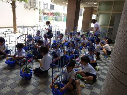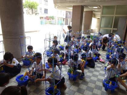 子どもたちが毎日水をあげ、お世話をがんばっているおかげで、アサガオがぐんぐん成長してきました。もうつるが伸び始めたものもあるので、みんなで支柱をたてました。どんな色の花が咲くのか、楽しみです
