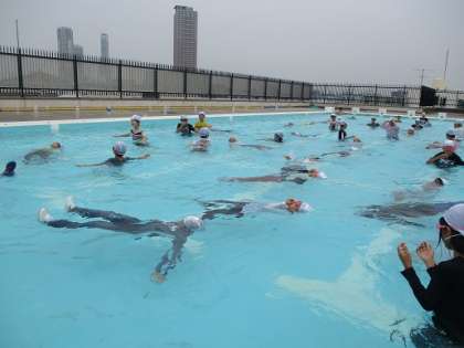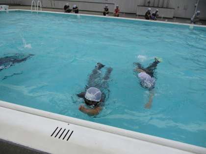 服を着た状態で、水の中での浮き方を学習しました。水を含んだ服の重さに苦戦しながら、クロール、平泳ぎと必死に泳ぎました。