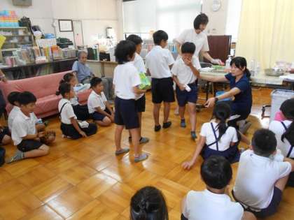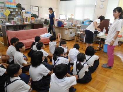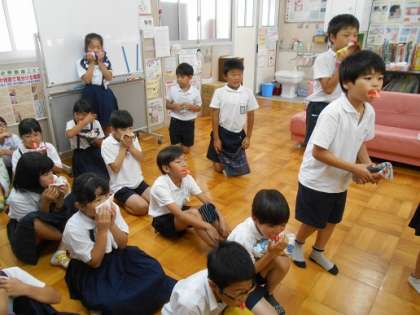 学習の後には、フッ化物塗布の時間がありました。しっかりとしみこませるために3分間我慢しないといけません。タオルをもってじっと我慢しているみんなの姿が立派でした。しっかりと話を聞き、学習したことがいきていたと思います。