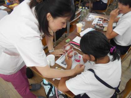 歯にどれだけ歯垢が残っているか染色して確かめると、歯ブラシをしにくい前歯の横や歯と歯茎の間が染まっている子が多かったです。鏡を使い、苦戦しながらもきれいに磨くことができました。