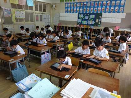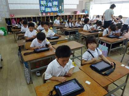 1学期の学習もまとめに入り、今日はタブレットドリルを使って、算数の練習問題に取り組みました。間違っているかどうか、すぐに分かり、全問正解した場合は応用問題へ、間違えた場合は復習問題へと進み、苦手なところを繰り返し学習できます。子どもたちは、「こうやったら、できるで」「ここ押してみて」と使い方を教え合いながら、どんどん問題にチャレンジしていました。