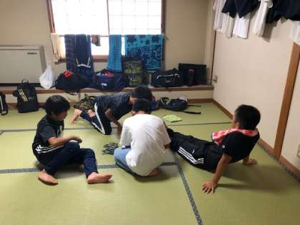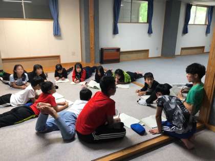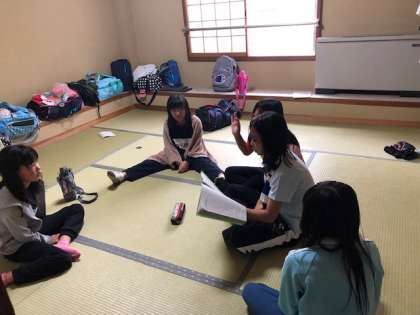 お風呂も済ませ、さっぱりとした後、リーダーさんは次の活動のためにリーダー会議です。今晩は風がきついのでキャンプファイアーは延期してナイトウォークになりました。