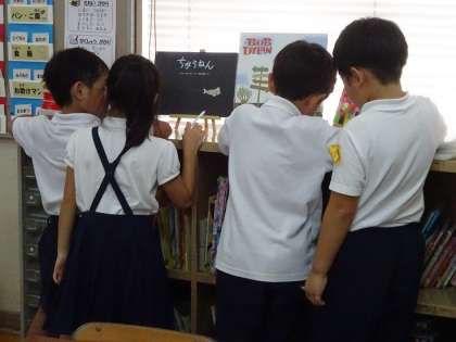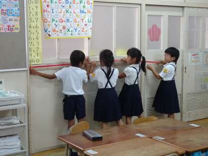 今日の算数では、鉛筆のように直接並べて「ながさくらべ」ができないものについて学習しました。ロッカーの横の長さや教卓の横の長さなどを紙テープに写し取り、それぞれの長さを比べます。2mほどの長いテープなので、班で協力しないとうまくできません。子どもたちは、端を持つ子、鉛筆で印をつける子など、みんなで役割分担をして活動していました。