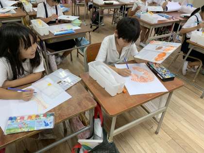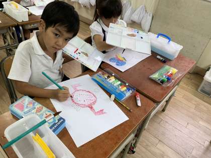 絵の具の使い方もみんな上手になってきました。今回は点だけで作品を仕上げています。時間も集中力もいりましたが一人ひとり一生懸命頑張っています!!