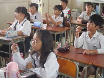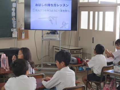 毎月、月初めの水曜日の朝の時間に給食委員会の人たちが給食目標に合わせたクイズを出してくれています。今月は「正しい食事のマナーを身につけよう」です。テレビ放送を見ながら、鉛筆2本をもってみんなでおはしの持ち方の練習しました。お家でもチェックしてみてください。