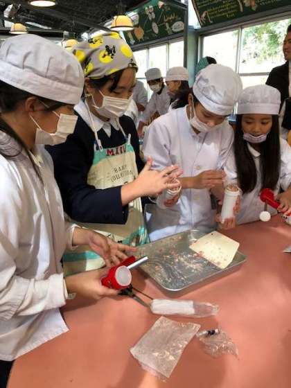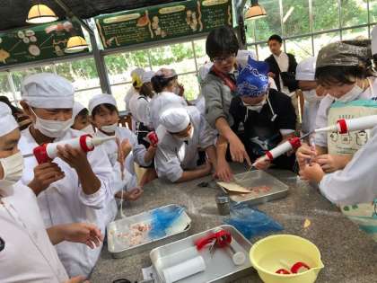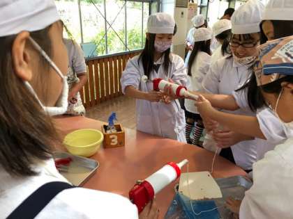 悪戦苦闘しながらウィンナーの中身を詰めています。