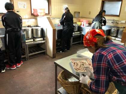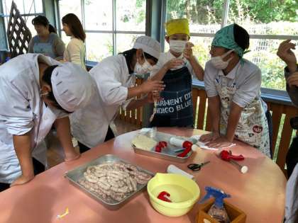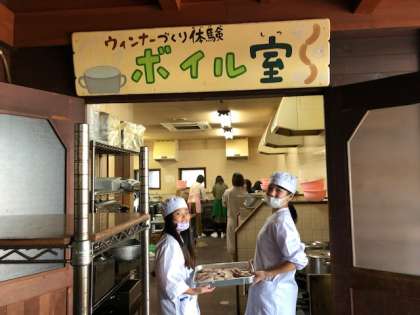 出来上がったウィンナーをボイル室へ運んでぼいるされるのをまちます。いよいよ完成間近です。