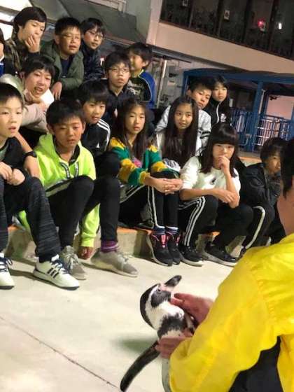 ?おいしい晩御飯をお腹いっぱい食べた後は夜のマリンランド見学です。可愛いペンギンにタッチしたら普段は見ることのないバックヤードで餌やりをしたりと体験活動わ楽しみました。
