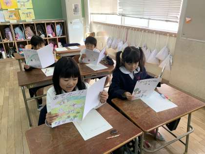 「絵を見てお話を作ろう」では、自分たちが考えたお話の内容を読み合いました。一人ひとり違った内容のお話ができたのでおもしろい作品ができました。お互いに読み合って感想を交流しました。