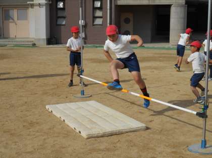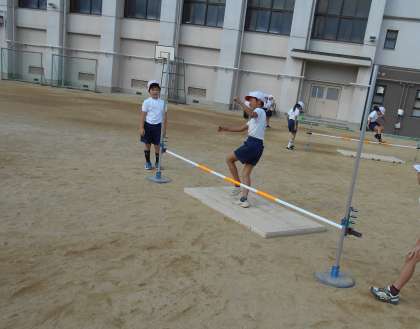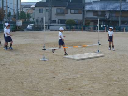 体育の時間、高跳びをしています。助走の歩数を決めて、強く踏み切って高く跳ぶ練習をしています。お互いに見合って教えあって活動しています。いい記録を出そうと取り組んでいます。