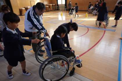 今日の2・3時間目に車いす体験をしました。社会福祉協議会や地域の方々の協力を得て、体育館と運動場とで行いました。始めに車いすの説明があり、その後2グループに分かれて体験しました。でこぼこしたところや段差、スロープでは後ろ向きに進むなど、たくさんのことを学びました。