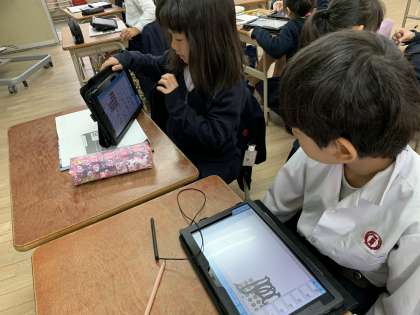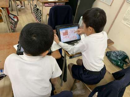 かけ算をずっとしてきています。今日は、タブレットを使って図形の中の数をかけ算を使って考えました。一人ひとりが考えた数える方法を友だちに見せながら説明しました。いろいろな考え方があり学習が深まりました。