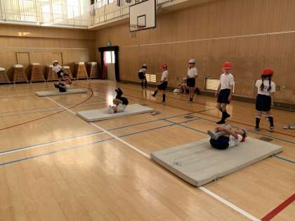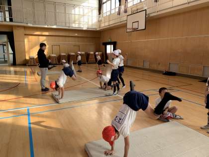 マット運動を始めています。「ゆりかご」や「カエルうち」から前転や後転の技につなげていきます。まだまだ練習が必要ですので3学期も引き続き頑張らせたいと思います。ご家庭でも見てあげてください。