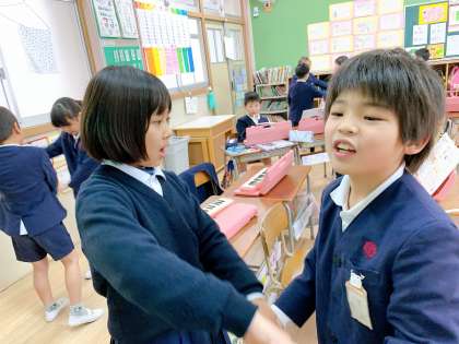 『あんたがたどこさ』の学習では,いろいろな遊び方を自分たちで考えて遊んでみたり,『なべなべそこぬけ』の学習では,歌と身振りに合わせて,鍵盤ハーモニカで伴奏を演奏したりと,自分たちで工夫し学習を楽しみました。