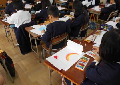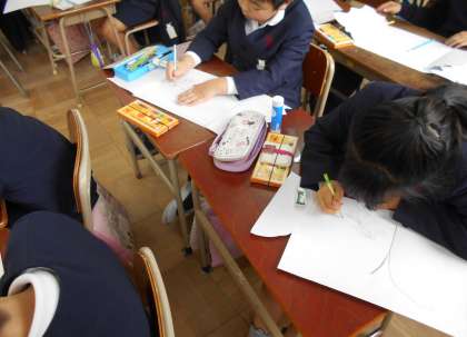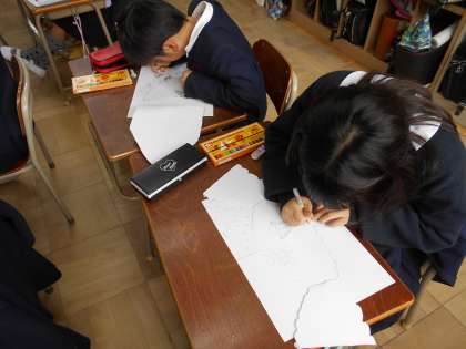 図工の時間は、扉を開けると広がる不思議な世界を想像して、画用紙に作品を作っています。今日は下書きが終わって色をつけるところになりました。いろいろな世界があるので、できあがりが楽しみです。