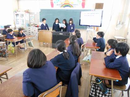 国語科の学習で「伝えよう、委員会活動」という単元を学習していました。来年度5年生になる4年生に向けて、委員会活動ではどのようなことをしているのか、リーフレットと動画を使って紹介します。その本番が今日ありました。今日に向けて、委員会ごとにたくさん話し合って伝わりやすい内容にするために、たくさん工夫していました。4年生にしっかりと伝わっているといいですね!