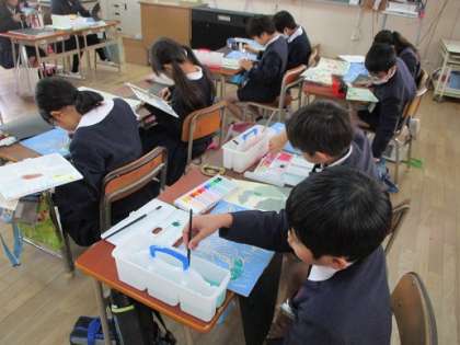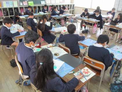 図工の版画も絵の具で色を付け始めました。初めてのことなので、水加減をどれくらいにするのか、いろいろと試しながら始まりました。今まで最後にどうなるのか想像できていない子もいましたが、少しずつ絵が出来上がっていく喜びを味わい始めています。この勢いで、どんどん完成させていってほしいです。