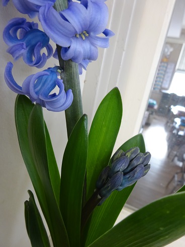 1年生の きょうしつの ヒアシンスがさきました。とても いいかおりが しています。ちかづいて 見てみると なんと!もう1本 くきが のびて つぼみが ついています。こんな ヒアシンスは はじめて 見ました。