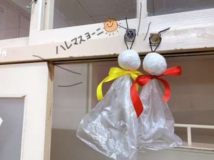 明日のお天気が,雨模様ということでしたので,てるてるぼうずを作ってみました。(ビニール袋製なので水に強いタイプ!)