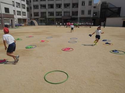 今日の体育も「走る」ことをテーマに取り組みました。3つのチームに分かれた協力戦・頭脳戦です!!最初は難しかったみたいですが、頑張っていました!!みんなの必死な姿が印象的でした。盛り上がったので、「次回もしようね」と約束して終わりました。次回までにいい作戦考えといてねー!!