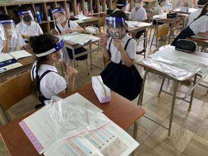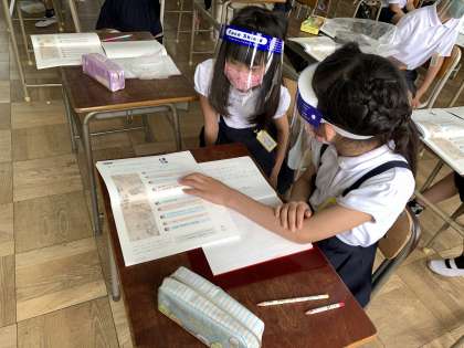 国語の学習では、対話をしながら物語を作っていきました。話し合う時にはフェースシールドをして話し合いました。これからはフェースシールドを活用しながら話し合いをしていきたいと思います。