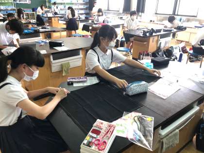 今日は家庭科で「お弁当つつみ」を作りました。1回目だったので、布に印をつけ、しつけ縫いをしました。
