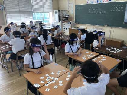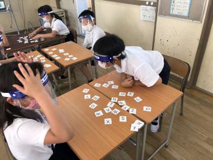 今日の外国語の時間では、アルファベットカードでかるたをしました。フェイスシールドをつけながら、ペアで勝負しました。机が鳴りひびくほどの接戦をくりひろげていました!!