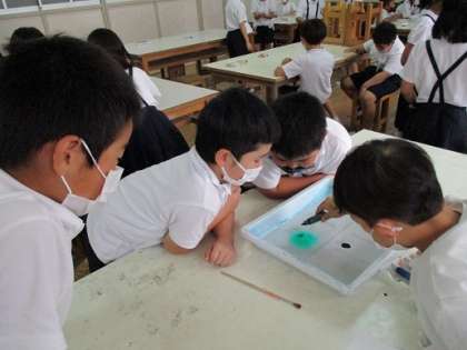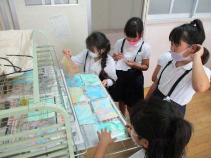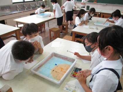 4年生の最初の図工は「絵の具でゆめもよう」という題材です。毎回いろいろな技法に挑戦し、最後に一つの絵にしてもらおうと思っています。今回は「マーブリング」です。「幼稚園や保育所でしたことある」と言っていた子もいました。グループで協力しながら取り組めていました。出来上がりがきれいなので、みんな楽しそうに何度も取り組んでいました。