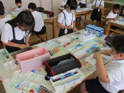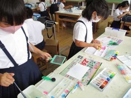 今日は「絵の具でゆめもよう」2回目です。今回は『スパッタリング』という技法を体験しました。最初は(どうなるの?)と予想がつかず、心配そうでしたが…やり始めると楽しくて、どんどんやっていました。あっという間に時間が過ぎてました。