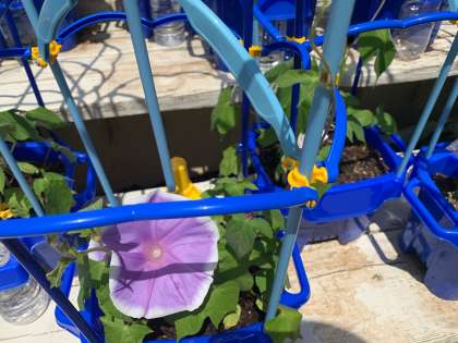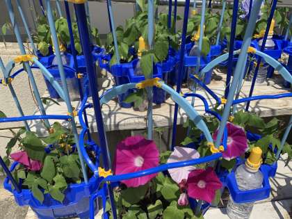 一生懸命お世話をしている朝顔の花が咲き始めています。1年生のみんなが愛情とお水をたっぷり注いでいるので,とてもきれいな花に育っております。