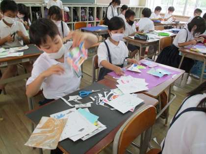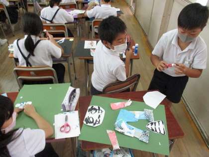 今日から「絵の具でゆめもよう」の作品作りが始まりました。いろいろな技法でできた世界に一つしかない模様の紙を【切って】【貼って】絵にしていきます。みんなそれぞれ楽しそうに作っていました。どんなものが出来上がるか楽しみです!!