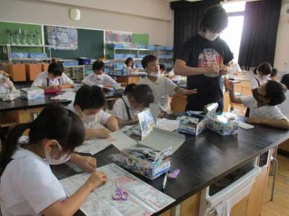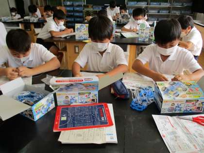 みんなの顔がイキイキしてるなーって思ったら、「電気」の学習が始まり、最終的に車になる実験道具をもらっていたみたいです。今日はこれから実験していくためのいろいろな準備をしていました。「1つミスったら車動かんくなるかもよー」と声をかけると、真剣な表情で取り組んでいました!!