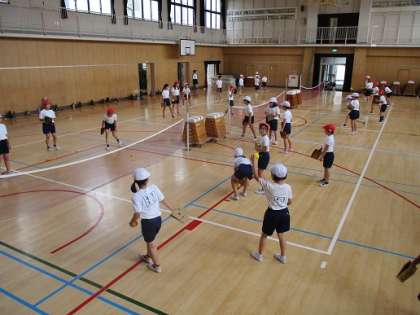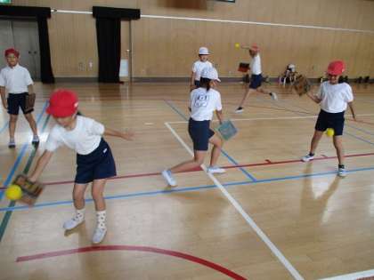 完成したマイラケットを持って「テニピン」の学習を始めました。自分で作ったということもあり、うれしそうに・大事そうに使っていました。今回は【サーブ・キャッチ】をしました。スポンジボールに慣れること、力の入れ方を見つけることなど、ペアになってボールをしっかりと打つ練習をしました!!ネットをこえなかったり、狙った場所に打てなかったりと、失敗も多かったですが、楽しく取り組むことができました。