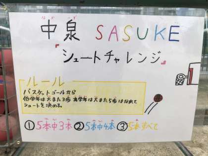 7月30日に中泉SASUKE種目別選手権があります。いろんな種目にたくさん挑戦してもらうために、運動委員会の人たちが、ルール説明のカードを作ってくれました。