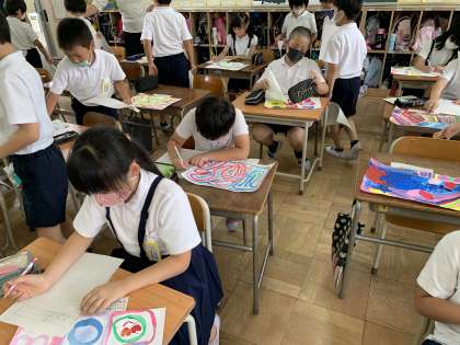 以前から仕上げていた作品の鑑賞をしました。短い時間でしたがたくさんの友だちのいい所や工夫している所を見つけて感想を書きました。一人ひとり一生懸命描いた作品はどれも素晴らかったです。