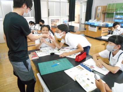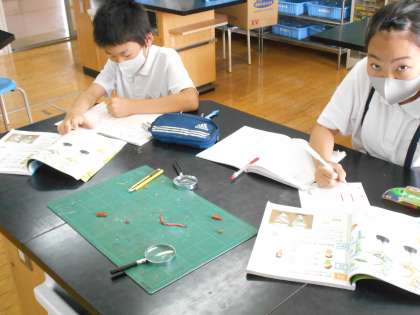 根や茎は、根や茎のどの部分を通って水分を吸収しているか、実際の植物や教科書を使って確認しました。