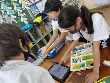 5年生でも経験していたらしく、子どもたちがタブレットを使用することに慣れていることがわかりました。扇風機をあっという間に動かすことができると、他にもロボットや飛行機なども組み立てて動かしていました。