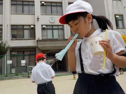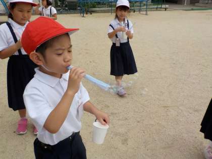 生活科の学習で,1年生みんなでしゃぼんだまをとばしました。童謡にあるように「やねまでとぶかな〜?」「とばへんやろ〜」などと話していたのですが,なんと,6年生が勉強している4階の部屋までとんでいたらしいのです!また学校で,子どもたちにも伝えようと思っています。