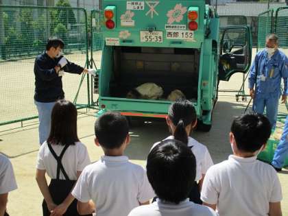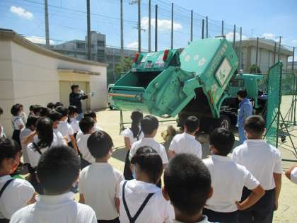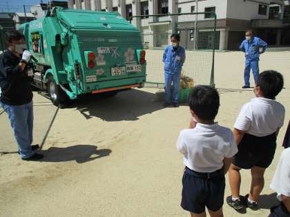 休み時間後に、ごみを収集するパッカー車を見せてもらいました。実際に動かしてもらいました。大きな車が、いろいろと動きをかえることで、「おー!!」っと歓声が上がっていました。