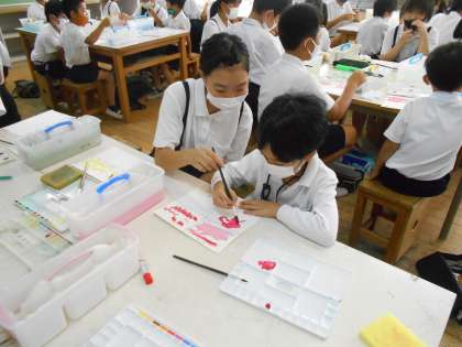 今日は、2年生と6年生の関りを深めるために、2年生の絵具の授業のお手伝いをしました。