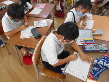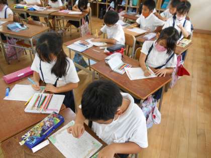 先週の木曜日に6年生に絵の具の使い方を教えてもらったお礼のお手紙を書いたものに色をつけました。色鉛筆をたくさん使ってきれいに仕上げました。明日、6年生に渡す予定です。喜んでもらえるといいですね。