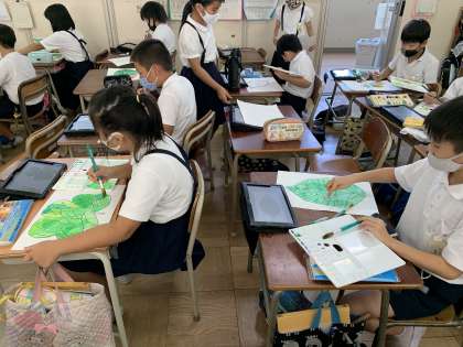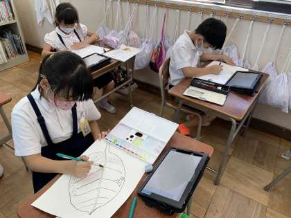 タブレットを使って植物の葉を調べてそれを描いています。自分が気に入った葉を選び、よく観察して作品を仕上げています。タブレットでは見たい部分を大きくできるので便利ですね。