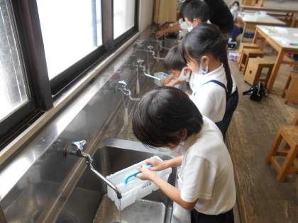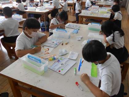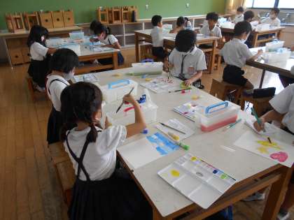 今日の図工の時間は、自分たちで絵の具の用意をして点と線を描きました。思い思いに点と線を描いて、絵にして仕上げました。その後、後片付けも自分でしました。6年生に教えてもらっていたので、スムーズにできました。6年生の皆さん、ありがとう。