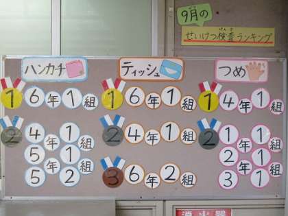 9月の清潔検査の結果が保健室前に発表されていました。校内の平均も高い中、4年1組は全ての項目でランクインすることができました。みんなの意識が少しずつ変わってきたことも伝わってきます。どうせなら100%・1位を目指しましょう。さすが6年生ですね!!中泉尾を引っ張ってくれる、4年生にとってあこがれの存在です。